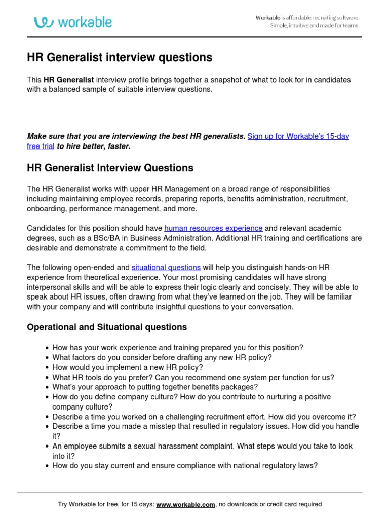 Hr Generalist Interview Questions Pdf Recruitment Organizational Culture